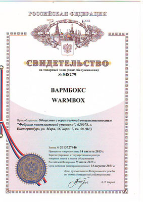 Фабрика Пенопластовой Упаковки получила Свидетельство (Патент) на товарный знак ВАРМБОКС WARMBOX № 548279 для Самого Универсального в Российской Федерации Пенопластового Термоконтейнера "Вармбокс®".